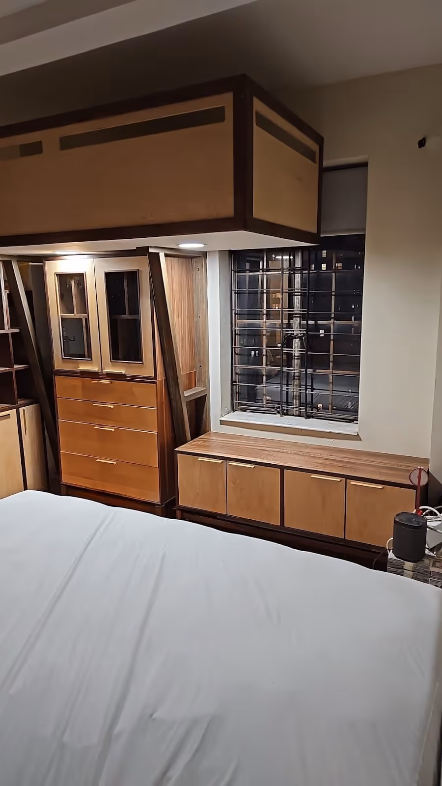 We added a tall cabinet with glass-paneled doors, multiple drawers, and a long under-window storage bench—keeping the room tidy while preserving light and openness.